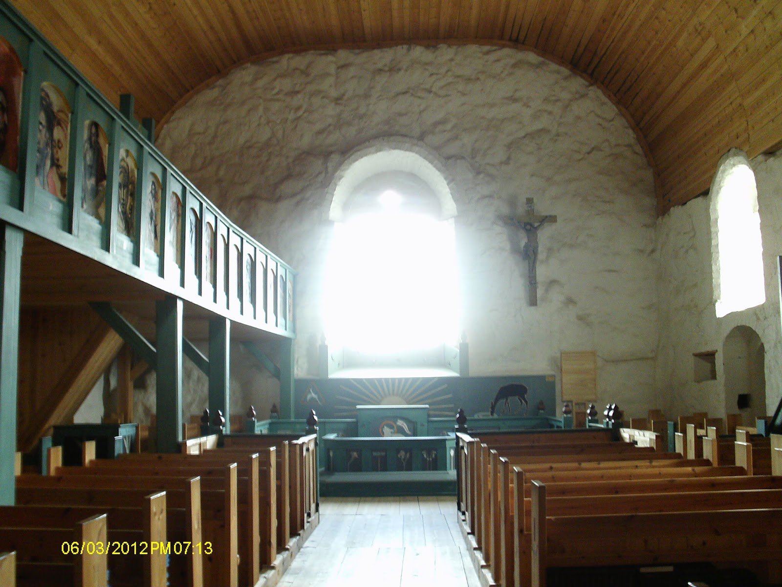 It was built as a catholic church but became Lutheran after the reformation. It was used until 1855 and then left as a new church was built in the town centre. Towards the end of the 20th century it was reopened and became a popular venue for weddings. It needed a lot of restoration work including replacing the 18th century wooden roof. 17,000 aspen saplings were used but shortly after it was finished the church was almost burnt to the ground after an arson attack. However, it was rebuilt with a replacement roof and with some much more modern artworks.